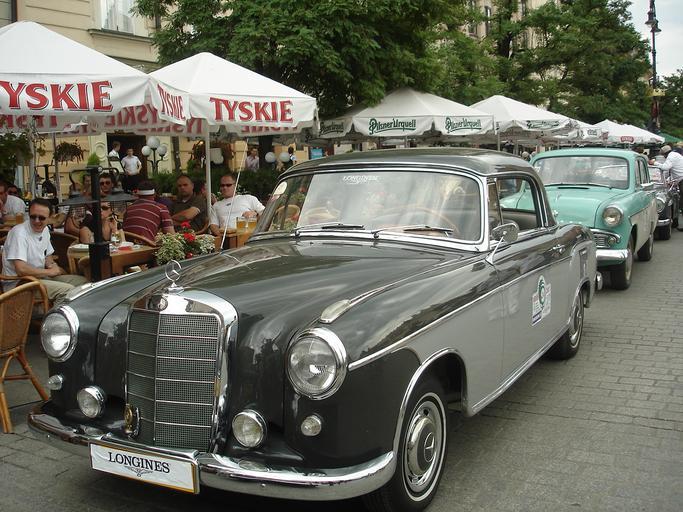 Keywords: 01439Kraków.JPG Street scene in Kraków Poland Own 2007-07 Rj1979 Mercedes-Benz W128 Historical vehicles in Poland Longines in Kraków 2007 Tyskie beer Pilsner Urquell