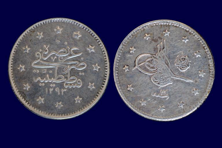 Keywords: 1293 Ottoman 2 piatres.jpg en A silver coin of 2 piasters of the Ottoman Empire Own collection Photo © 2010 K Krallis SV1XV 1877 Ottoman year 1293 http //www flickr com/photos/g7ahn/4507935940/ Focal length 90 mm LED For the original coin PD-Ottoman For the photograph CC-BY-SA-3 0 Coins of the Ottoman Empire |