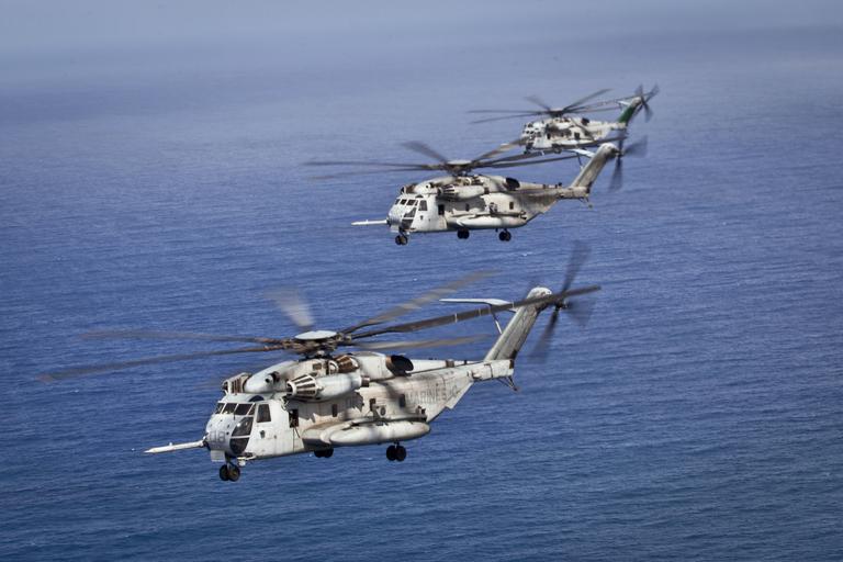 Keywords: birds black hawks blackhawks chopper copter extraction helo insertion ocean pacific honolulu hawaii united states unitedstates us outdoor boat vehicle aircraft U.S. Marine CH-53E Super Stallion helicopters assigned to Marine Heavy Helicopter Squadron 463, fly in formation off the coast of Oahu, Hawaii, April 29th, 2016, after interoperability operations with the 25th Infantry Division's 25th Combat Aviation Brigade. (U.S. Marine Corps photo by Cpl. Aaron S. Patterson) U.S. Marine CH-53E Super Stallion helicopters assigned to Marine Heavy Helicopter Squadron 463, fly in formation off the coast of Oahu, Hawaii, April 29th, 2016, after interoperability operations with the 25th Infantry Division's 25th Combat Aviation Brigade. (U.S. Marine Corps photo by Cpl. Aaron S. Patterson) |