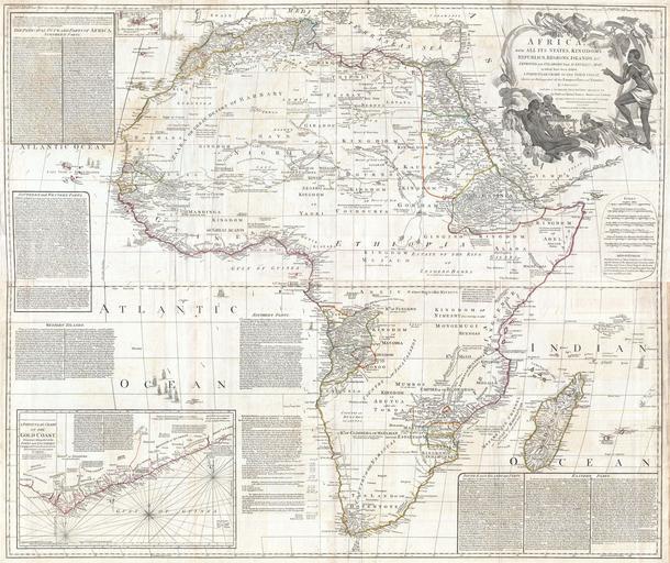 Keywords: 1794 Boulton and Anville Wall Map of Africa (most important 18th cntry map of Africa) - Geographicus - Africa2-boulton-1794.jpg This is probably the most important map of Africa produced in the 18th century Largely based upon the earlier D ™Anville map this map has been enlarged and expanded by Samuel Boulton Depicts the continent in full with insets of the Gold Coast or Ivory Coast or Guinea This map is unique in that it is a serious attempt to compile all of the accurate scientific knowledge of the African continent available at the time In contrast to many other Africa maps of the period there almost no attempt to fill the unknown regions of the interior with fictitious beasts kingdoms and geological features Boulton himself advertises The inland parts of Africa being but very little known and the names of the regions and countries which fill that vast tract of land being for the greatest part placed by conjecture it may be judged how absurd are the divisions traced in some maps and why they are not followed in this Despite this this map actually does provide a wealth of information both in the form of a gazetteer printed in framed text boxes here and there on the map as well as political and geographical features This map bears up to almost endless perusal and volumes could be composed on its content The cartographer attempts to depict both known and unknown parts of the continent with actual data reported by both contemporary and ancient travelers In most cases it is extremely difficult to identify specific sources as much of the data is vague and uncertain Boulton for example notes a community of Jews near what would today be Mali Though a very small community of Jewish traders did live in Mali in the 15th century most had been killed or converted to Islam by the 16th century No doubt Boulton's sources here were extremely archaic Boulton also relies heavily on the geography of Claudius Ptolemy noting this source in numerous notations which range from commentary on local peoples to the courses of important river systems Clearly much of the map is focused on commerce and where information is available Boulton makes notes on local commercial products and mineral wealth There are also copious notations on caravan routes especially those routes which were known to offer caravan transverse of the Sahara Generally following Ptolemy Boulton includes a number of mysterious river systems which seem to appear out of nowhere and run to nowhere With regard to the White Nile which he presumes correctly to be greater than the Blue Nile he follows the ancient two lakes at the base of the Mountains of the Moon theory In the southern half of Africa there is considerably less information on the interior save for those lands mapped by the Portuguese along the Congo and Zambezi Rivers The regions around the Zambezi called Monomotapa are particularly interesting as many considered this area to be the Biblical land of Ophir where one could discover the mines of King Solomon Just north of Monomotapa we find an embryonic representation of Lake Malawi here called Maravi In South Africa the Dutch Company is strongly established and the region is well mapped well into the interior Prepared by Samuel Boulton and published by Laurie Whittle in Kitchin's 1794 General Atlas 1794 dated Size in 49 41 object history credit line accession number Africa2-boulton-1794 Kitchin Thomas <i>Kitchin's General Atlas describing the Whole Universe being a complete collection of the most approved maps extant; corrected with the greatest care and augmented from the last edition of D'Anville and Robert with many improvements by other eminent geographers engraved on Sixty-Two plates comprising Thirty Seven maps </i> Laurie Whittle London 1797 Geographicus-source PD-Art-100 <gallery> File 1794 Boulton and Anville Wall Map of Africa most important 18th cntry map of Africa - Geographicus - Africa2-boulton-1794 A 001 jpg The Gold Coast as detail; cropped by Katharinaiv </gallery> 1790s maps of Africa 1794 maps Africa in the 18th century 02 Old maps of Ghana Maps in English |