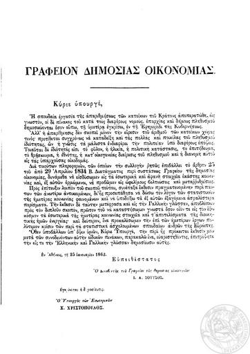 Keywords: Επιστολή - Απογραφή Ελλάδος 1861 - Γραφείον Δημοσίου Οικονομίας - 1862.jpg en Letter by the Office of Public Finance to the Minister of Interior informing of the successful completion of the 1861 Greece cencus el Ε ιστολή του Γραφείου Δημοσίου Οικονομίας ρος τον Υ ουργό Εσωτερικών σχετικά με την ε ιτυχή ολοκλήρωση της α ογραφής του 1861 στην Ελλάδα 1862 http //dlib statistics gr/portal/page/portal/ESYE/showdetails p_id 14327806 p_derive book Hellenic Statistical Authority Digital Library / ELSTAT - 1861 census report Office of Public Economy / Ministry of Interior Affairs - Kingdom of Greece - 1862 other versions cc-zero Book pages in Greek |