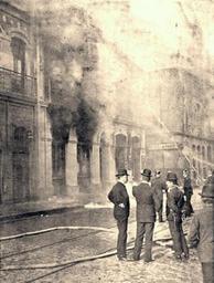 Keywords: 1903, Valparaíso, Huelga Portuaria - CSAV en Llamas.jpg es Las primeras llamas del ataque incendiario al edificio de la Compañía Sud-Americana de Vapores Unknown Unknown author PD-Chile Huelga Portuaria de Valparaíso 1903 Uploaded with UploadWizard |