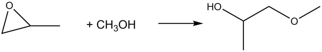 Keywords: 1-methoxy-2-propanol reaction.png propylene oxide + methanol -> 1-methoxy-2-propanol Own 2008-02-07 Klever Public Domain Functional group interconversions Reactions of epoxides Propylene oxide Methoxypropanol
