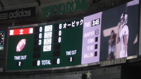 Keywords: 2010-7-1-football-scoreboard.jpg ja アメリカンフット ールで使用時の 京ドームの電光掲示 Phirami0725 Phirami0725 2010-7-2 Interior of Tokyo Dome Aurora Vision Fujitsu American football scoreboards American football in Japan
