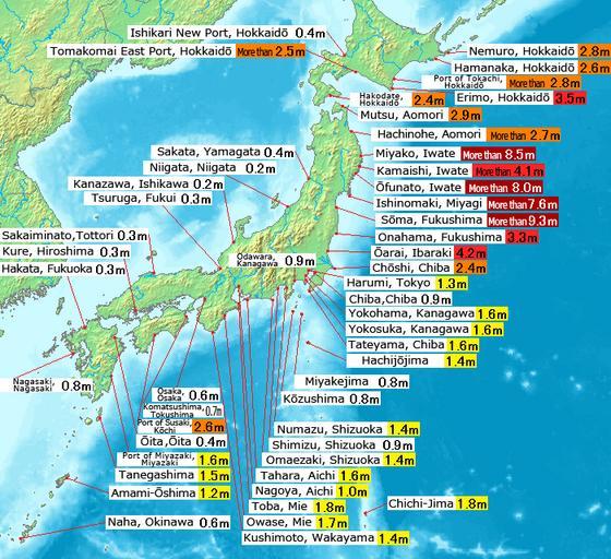 Keywords: 2011 Tohoku earthquake observed tsunami heights en.png en Map of 2011 Tohoku Sendai earthquake observed tsunami heights in Japan ja 北 方太平洋沖 で観測された 日 各 の津波の高さ 英語版 2011 Tohoku earthquake observed tsunami heights png JMAhttp //www jma go jp/jp/tsunami/observation_04_20110313180559 html 1 http //www jma go jp/jma/press/1103/14c/tsunami_onahama html 2 http //www jma go jp/jma/press/1103/23b/tsunami_miyako_ofunato html 3 http //www jma go jp/jma/press/1103/29c/201103291900 html 4 map http //www demis nl/home/pages/Gallery/examples htm demis Original by Pekachu translated by Eastwind41 2011-05-14 Pekachu PD-Demis SVG re-designed version available<br>120px Retouched picture Place name translating to English language 名の英訳 Maps and diagrams of the 2011 Tōhoku earthquake |