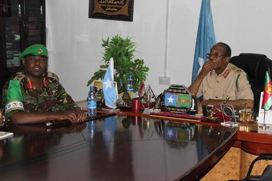 Keywords: The Force Commander of the African Union Mission in Somalia (AMISOM), Lt. Gen. Jonathan Rono (right) during the meeting with the Somali National Army (SNA) Chief of Defence Forces Maj. Gen. Mohamed Adan Ahmed (right) in Mogadishu, Somalia on October 27, 2015. AMISOM Photo / Raymond Baguma The Force Commander of the African Union Mission in Somalia (AMISOM), Lt. Gen. Jonathan Rono (right) during the meeting with the Somali National Army (SNA) Chief of Defence Forces Maj. Gen. Mohamed Adan Ahmed (right) in Mogadishu, Somalia on October 27, 2015. AMISOM Photo / Raymond Baguma |