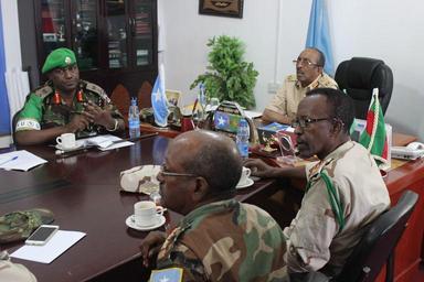 Keywords: The Force Commander of the African Union Mission in Somalia (AMISOM), Lt. Gen. Jonathan Rono during the meeting with the Somali National Army (SNA) Chief of Defence Forces Maj. Gen. Mohamed Adan Ahmed and other SNA senior officers in Mogadishu, Somalia on October 27, 2015. AMISOM Photo / Raymond Baguma The Force Commander of the African Union Mission in Somalia (AMISOM), Lt. Gen. Jonathan Rono during the meeting with the Somali National Army (SNA) Chief of Defence Forces Maj. Gen. Mohamed Adan Ahmed and other SNA senior officers in Mogadishu, Somalia on October 27, 2015. AMISOM Photo / Raymond Baguma |