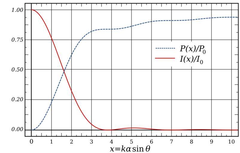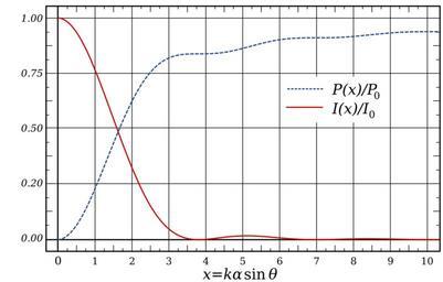 Keywords: Airy Pattern Intensity and Encircled Power.svg Airy pattern <math>I \theta I_0 \left \frac 2 J_1 ka \sin \theta ka \sin \theta \right 2 I_0 \left \frac 2 J_1 x x \right 2</math> <math>P \theta P_0 1 - J_0 2 ka \sin \theta - J_1 2 ka \sin \theta </math> own Inductiveload 2009-03-04 Mathematica Code <pre><nowiki> encircledPowerx_ 1 - BesselJ0 x 2 - BesselJ1 x 2; airyPatternx_ 2 BesselJ1 x/x 2; Plot airyPatternx encircledPowerx x 0 11 </nowiki></pre> Airy disks |