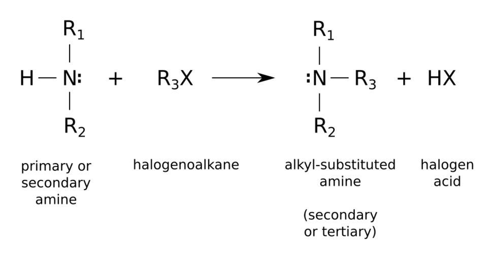 Keywords: Alkylation of amine.svg Chemical reaction Amine plus halogenoalkane forms alkyl-substituted amine plus halogen acid File Alkylation of Amine PNG 2005-01-26 H Padleckas translation possible Nucleophilic substitution reactions