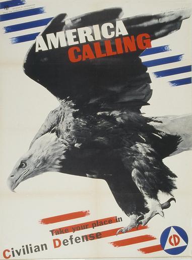 Keywords: America Calling - Take Your Place in Civilian Defense Propaganda Poster.tif en Ink on paper poster encouraging participation in civilian defense during World War II; image depicts a black and white photographic image of an eagle in flight with blue and red horizontal stripes illustrated at the wings and feel of the eagle set against a white ground 1941-01-01 http //digital wolfsonian org/WOLF000142/00001 Herbert Matter other versions PD-USGov Uploaded with UploadWizard Government propaganda Posters of the United States Printed objects Ephemera Nationalism in the United States World War II Visual arts Images from The Wolfsonian-FIU |