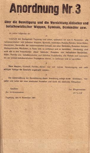 Keywords: Anordnung3 Taganrog.jpg en Anordnung Order of the German occupation authorities on elimination and destruction of Jewish or Soviet coat of arms symbols monuments etc archive scan Nazi Germany occupation authorities 1941-11-04 PD-Old PD-old History of Taganrog |