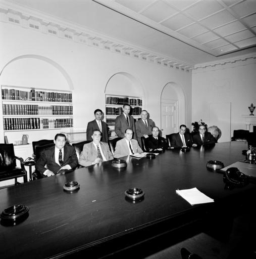 Keywords: u.s. national archives usnationalarchives jfk presidential library jfkpresidentiallibrary blackandwhite monochrome indoor black and white Original Caption: Assistant Press Secretary, Jay W. Gildner, with Visitors in Cabinet Room We are looking for your help in identifying unknown people in our White House Photographs collection. If you have any information about this photograph, please post a comment, including any relevant sources, for the catalogers at the John F. Kennedy Presidential Library. Thank you! Local Identifier: JFKWHP-ST-224-1-61 Created By: President (1961-1963 : Kennedy). Office of the Naval Aide to the President. (1961 - 1963) From: President (1963-1969 : Johnson). White House Photograph Office. (1963 - 1969) Contact: John F. Kennedy Library (LP-JFK), Columbia Point Boston, MA 02125-3398 Phone: 617-514-1600 Fax: 617-514-1652 Email: kennedy.library@nara.gov Production Dates: 10/11/1961 Scope and Content Note: In this photograph Assistant Press Secretary, Jay W. Gildner (center), stands with eight unidentified visitors in the Cabinet Room of the White House, Washington, D.C. Persistent URL: JFK Library URL: www.jfklibrary.org/Asset-Viewer/Archives/JFKWHP-ST-224-1-61.aspx Access Restrictions: Unrestricted Use Restrictions: Unrestricted Original Caption: Assistant Press Secretary, Jay W. Gildner, with Visitors in Cabinet Room We are looking for your help in identifying unknown people in our White House Photographs collection. If you have any information about this photograph, please post a comment, including any relevant sources, for the catalogers at the John F. Kennedy Presidential Library. Thank you! Local Identifier: JFKWHP-ST-224-1-61 Created By: President (1961-1963 : Kennedy). Office of the Naval Aide to the President. (1961 - 1963) From: President (1963-1969 : Johnson). White House Photograph Office. (1963 - 1969) Contact: John F. Kennedy Library (LP-JFK), Columbia Point Boston, MA 02125-3398 Phone: 617-514-1600 Fax: 617-514-1652 Email: kennedy.library@nara.gov Production Dates: 10/11/1961 Scope and Content Note: In this photograph Assistant Press Secretary, Jay W. Gildner (center), stands with eight unidentified visitors in the Cabinet Room of the White House, Washington, D.C. Persistent URL: JFK Library URL: www.jfklibrary.org/Asset-Viewer/Archives/JFKWHP-ST-224-1-61.aspx Access Restrictions: Unrestricted Use Restrictions: Unrestricted |