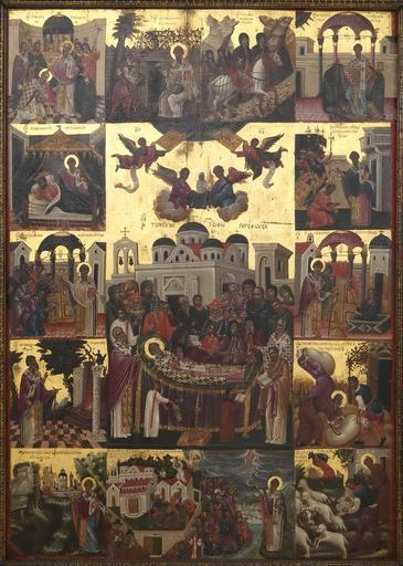 Keywords: Assumption of St. Spyridon by E. Tzanfournaris (1595).jpg Η Κοίμηση του Αγίου Σ υρίδωνος και σκηνές του βίου του 1595 60 5x42 8εκ Εμμανουήλ Τζανφουρνάρης Ε Α ΟΥΗΛ ΤΟΥ ΤΖΑ ΦΟΥΡ ΑΡΗ ΧΕΙΡ Στο κεντρικό διάχωρο της εικόνας αριστάνεται η Κοίμηση του Αγίου Σ υρίδωνος Ο ζωγράφος χρησιμο οίησε ως ρότυ ο την αράσταση της Κοίμησης του Αγίου Δημητρίου ό ως φαίνεται στην εικόνα αρ 11 του Ελληνικού Ινστιτούτου της Βενετίας Η εξόδιος ακολουθία ραγματο οιείται μ ροστά α ό την εκκλησία και την αρακολουθεί λήθος ανθρώ ων μεταξύ των ο οίων υ άρχουν οι ψάλτες ένας διάκος και ένας αναγνώστης μ ροστά α ό την κλίνη Στο ε άνω τμήμα η ψυχή του αγίου μεταφέρεται α ό δύο αγγέλους στον ουρανό του ο οίου τις ύλες ανοίγουν δύο άλλοι άγγελοι Γύρω α ό το κεντρικό θέμα υ άρχουν δεκατέσσερις σκηνές α ό τον βίο του αγίου ε άνω ο άγιος χειροτονείται ε ίσκο ος μεταβάλλει τον όφι σε χρυσάφι ορεύεται στη σύνοδο κατα ατεί τον Άρειο και κηρύσσει την Αγία Τριάδα Αριστερά ο άγιος εμφανίζεται στο όνειρο του βασιλιά βα τίζει και διδάσκει τους α ίστους καταβάλλει τα είδωλα στο ναό Δεξιά ο βασιλιάς τιμά τον άγιο ο άγιος ανασταίνει τη θυγατέρα του βοηθά τους κλέφτες να άρουν το σιτάρι του Κάτω ο άγιος με την ροσευχή του στρέφει τον οταμό ρος τα ίσω διασώζει ένα ζευγάρι α ό τους Αγαρηνούς σταματά τις δυνατές βροχές δωρίζει την αίγα του στους κλέφτες http //eib xanthi ilsp gr/gr/icons asp 1595 Emmanuel Tzanfournaris Files uploaded by Shakko from various sources PD-old-100 16th-century icons of Greece Icons of Saint Spiridion Vita icon Emmanuel Tzanfournaris |