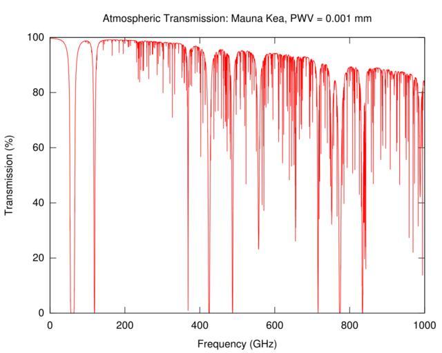 Keywords: Atmospheric Microwave Transmittance at Mauna Kea (simulated).svg Mauna Kea in the Gigahertz range at a precipitable water vapor level of 0 001 mm Created using http //pastebin com/raw php i uZ3mmJTY data from the http //www submm caltech edu/cso/weather/ CSO Atmospheric Transmission Interactive Plotter at the submillimeter wave astronomy site of Caltech 2012-06-05 own Westeros91 gnuplot To create this plot I used gnuplot and the http //pastebin com/raw php i uZ3mmJTY data from the http //www submm caltech edu/cso/weather/ CSO Atmospheric Transmission Interactive Plotter at the submillimeter wave astronomy site of Caltech To reproduce use the following gnuplot code <source lang gnuplot > /usr/bin/env gnuplot set terminal/output file set terminal svg enhanced size 850 680 font Helvetica 16 set output Atmospheric Microwave Transmittance at Mauna Kea simulated svg set plot title set title Atmospheric Transmission Mauna Kea PWV \ 0 001 mm remove legend unset key set title set ylabel Transmission set xlabel Frequency GHz set x/y tics set xtics 200 set ytics 20 plot data txt plot data txt using 1 3 100 with lines </source> cc-zero Uploaded with UploadWizard Plots Technical diagrams |