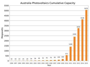 Keywords: Australia Photovoltaics Installed Capacity.svg translate yes en Cumulative installed photovoltaics in Australia from 1996 to 2015 Sources 2014 http //www iea-pvps org/fileadmin/dam/public/report/technical/PVPS_report_-_A_Snapshot_of_Global_PV_-_1992-2014 pdf 2015 http //www iea-pvps org/fileadmin/dam/public/report/PICS/IEA-PVPS_-__A_Snapshot_of_Global_PV_-_1992-2015_-_Final_2_02 pdf 2014-12-01 own Delphi234 other versions cc-zero Solar energy in Australia Photovoltaic power statistics |