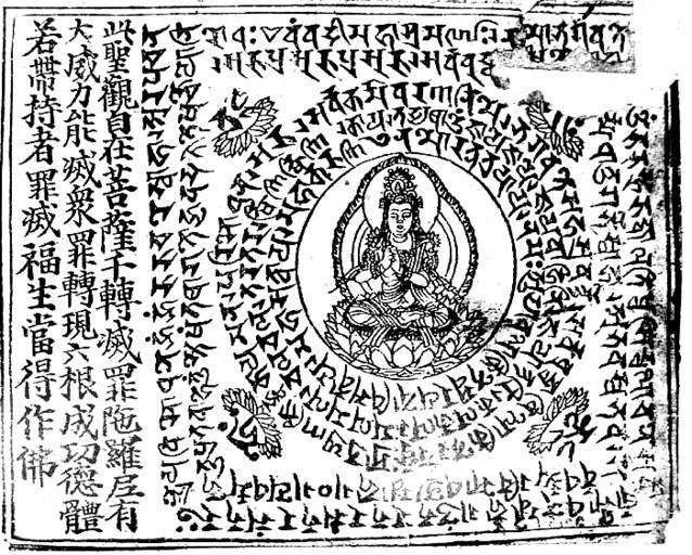 Keywords: Avalokiteshvara Mantra1.png zh 敦煌藏經洞版畫,聖 自 菩薩千轉滅罪 羅尼 photograph author none 260px PD-old Siddham script Buddhist mantras