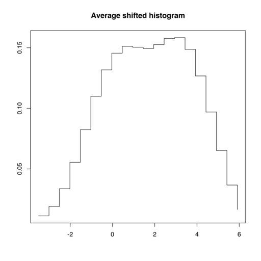 Keywords: AverageShiftedHistogram.svg en Average shifted histogram from the same data set as Histogram4 AverageShiftedHistogram png Sigbert 2009-01-31 AverageShiftedHistogram png n library ash set seed 1964 x <- c rnorm 100 3+rnorm 100 svg AverageShiftedHistogram svg f<-ash1 bin1 x nbin 20 plot f type n main Average shifted histogram xlab ylab for i in 2 length f x lines c f xi-1 f xi f xi c f yi-1 f yi-1 f yi dev off Sigbert Histograms |