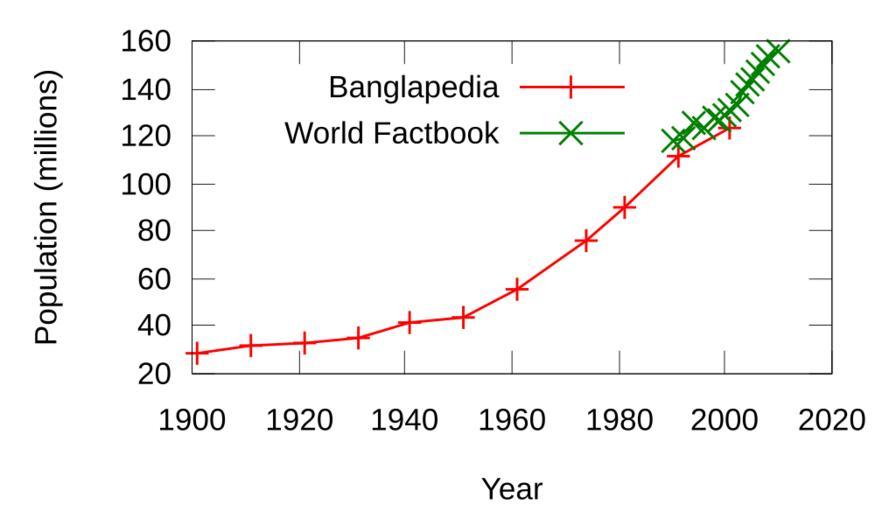 Keywords: Bangladesh population 1900to2010.svg en Bangladesh's population 1900-2010 Based on Bangladesh's contemporary territory Early data is from Banglapedia Census which was derived from Indian and Bangladeshi census information A second series is from CIA World Factbook 1990-2010 own Dejo2 2010-02-13 gnuplot gnuplot source <source lang gnuplot >set terminal svg enhanced size 350 200 set samples 1001 high quality set border 31 linewidth 3 thin border set output bangladesh_population_1900to2010 svg set xlabel Year set ylabel Population millions set key left top plot Banglapedia dat using 1 2/1e6 with linespoints title 'Banglapedia' \ World_Factbook dat using 1 2/1e6 with linespoints title 'World Factbook' </source> Banglapedia dat <source lang gnuplot > 1901 28927786 1911 31555056 1921 33254096 1931 35604170 1941 41997297 1951 44165740 1961 55222663 1974 76398000 1981 89912000 1991 111455185 2001 123151246 </source> Wold_Factbook dat <source lang gnuplot > 1990 118433062 1992 119411711 1994 125149469 1996 123062800 1998 127567002 1999 127117967 2000 129194224 2001 131269860 2002 133376684 2003 138448210 2004 141340476 2005 144319628 2006 147365352 2007 150448339 2008 153546896 2010 156050883 </source> Temporal population graphs of Bangladesh |