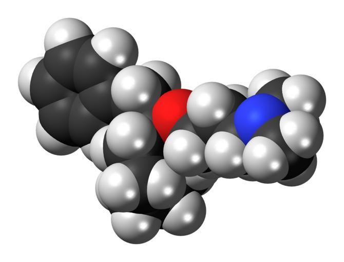 Keywords: Bencyclane 3D spacefill.png Space-filling model of the bencyclane molecule a calcium channel blocker Color code 505050 Carbon C black<br> F0F0F0 Hydrogen H white<br> F51E1E Oxygen O red<br> 3C50FA Nitrogen N blue<br> 2011-07-30 own DS Visualizer Jynto talk Ball-and-stick version cc-zero Bencyclane Images by Jynto Space-filling models |