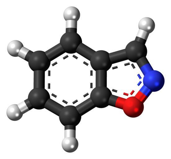 Keywords: Benzisoxazole-3D-balls.png Ball-and-stick model of the benzisoxazole molecule a nitrogen-oxygen heterocycle and a simple aromatic ring Colour code 505050 Carbon C black<br> F0F0F0 Hydrogen H white<br> F51E1E Oxygen O red<br> 3C50FA Nitrogen N blue<br> 2011-02-10 own DS Visualizer Jynto talk Space-filling version cc-zero Benzisoxazole Images by Jynto Ball-and-stick models |