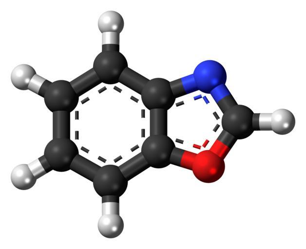 Keywords: Benzoxazole-3D-balls.png Ball-and-stick model of the benzoxazole molecule a nitrogen-oxygen heterocycle and a simple aromatic ring Colour code 505050 Carbon C black<br> F0F0F0 Hydrogen H white<br> F51E1E Oxygen O red<br> 3C50FA Nitrogen N blue<br> 2011-02-10 own DS Visualizer Jynto talk Space-filling version cc-zero Benzoxazole Images by Jynto Ball-and-stick models |