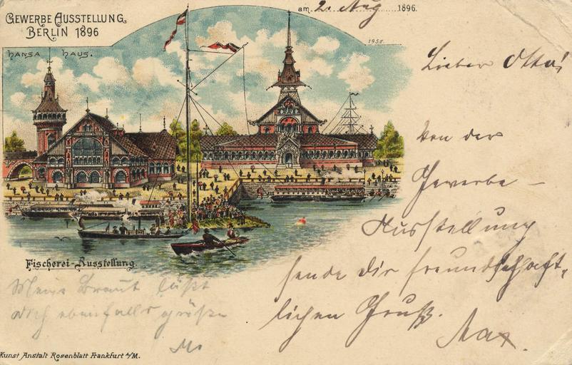 Keywords: Berlin, Treptow, Gewerbeausstellung 1896, Fischerei-Ausstellung.jpg old picture postcard of Berlin industrial exhibition 1896 in Treptower Park - view of fishery exhibition with Hansa-Haus alte Ansichtskarte zur Berliner Gewerbeausstellung 1896 im Treptower Park - Ansicht der Fischerei-Ausstellung mit dem Hansa-Haus http //www digitale-bibliothek de/scripts/ts dll s 6 id 1EBE9D6B mp /art/1722/ sc Deutschland htm Deutschland in alten Ansichten DVD-ROM 1896 publishing company Kunst Anstalt Rosenblatt Frankfurt a M PD because of age PD-old Berliner Gewerbeausstellung 1896 Postcards of Berlin-Alt-Treptow 1896 postcards of Germany Exhibition postcards Colored postcards Kunst Anstalt Rosenblatt |