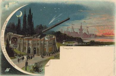 Keywords: Berlin, Treptow, Gewerbeausstellung 1896, Riesenfernrohr.jpg old picture postcard of Berlin industrial exhibition 1896 in Treptower Park - view of the giant long-glass today it is part of the Archenhold-Sternwarte alte Ansichtskarte zur Berliner Gewerbeausstellung 1896 im Treptower Park - Ansicht des Riesenfernrohres Heute ist es Teil der Archenhold-Sternwarte http //www digitale-bibliothek de/scripts/ts dll s 6 id 1EBE9D6B mp /art/1722/ sc Deutschland htm Deutschland in alten Ansichten DVD-ROM 1896 publishing company Kunstanstalt J Miesler Berlin S PD because of age PD-old Archenhold-Sternwarte Berliner Gewerbeausstellung 1896 Postcards of Berlin-Alt-Treptow 1896 postcards of Germany Exhibition postcards Telescopes in art Colored postcards Johannes Miesler |