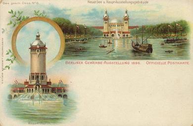 Keywords: Berlin, Treptow, Gewerbeausstellung 1896, Wasserturm und Neuer See.jpg en old picture postcard of Berlin industrial exhibition 1896 in Treptower Park - view of water tower and the new lake with the main exhibition building de alte Ansichtskarte zur Berliner Gewerbeausstellung 1896 im Treptower Park - Ansicht des Wasserturms und des Neuen Sees mit dem Hauptausstellungsgebäude http //www digitale-bibliothek de/scripts/ts dll s 6 id 1EBE9D6B mp /art/1722/ sc Deutschland htm Deutschland in alten Ansichten DVD-ROM 1896 publishing company Kunstanstalt J Miesler Berlin S PD because of age PD-old Berliner Gewerbeausstellung 1896 Postcards of Berlin-Alt-Treptow 1896 postcards of Germany Exhibition postcards Colored postcards Johannes Miesler |