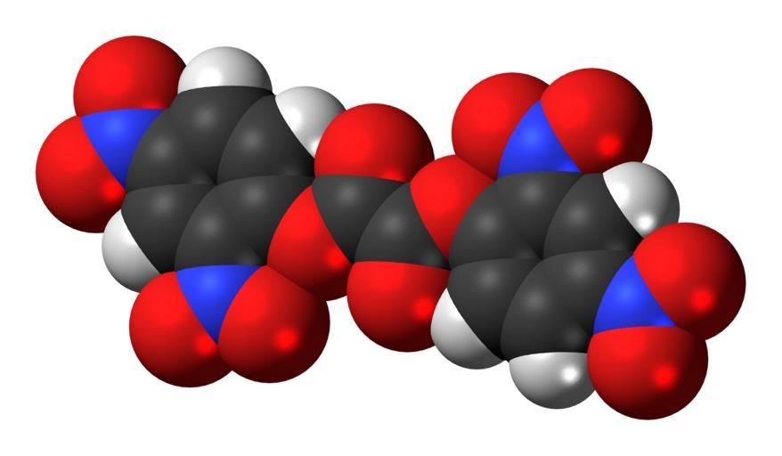 Keywords: Bis(2,4-dinitrophenyl)-oxalate-3D-spacefill.png Space-filling model of the bis 2 4-dinitrophenyl oxalate molecule also known as DNPO the di-ester of 2 4-dinitrophenol and oxalic acid Colour code 505050 Carbon C black<br> F0F0F0 Hydrogen H white<br> F51E1E Oxygen O red<br> 3C50FA Nitrogen N blue<br> 2011-06-10 own DS Visualizer Jynto talk Ball-and-stick version cc-zero Dinitrobenzenes Oxalate esters Images by Jynto Space-filling models |