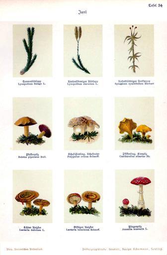 Keywords: Bley, Botanisches Bilderbuch 34.jpg See below Botanisches Bilderbuch für Jung und Alt 1897 Franz Bley H Berdrow PD-old Latin 1 - Lycopodium selago Lycopodium calavatum Sphagnum symbifolium Ehrhart - Boletus piperatus Chalciporus piperatus Polyporus ovinus Albatrellus ovinus Cantharellus cibarius - Lactaria deliciosa Lactarius deliciosus Lactaria torminosa Lactarius torminosus Amanita muscaria Deutsch 1 - Tannenbärlapp Keulenförmiger Bärlapp Kahnblättriges Torfmoos - Pfefferpilz; Pfefferröhrling Schafporling; Schafeuter Pfifferling Eierpilz - Echter Reizker Giftiger Reizker; Birkenreizker Fliegenpilz Bley Botanisches Bilderbuch |