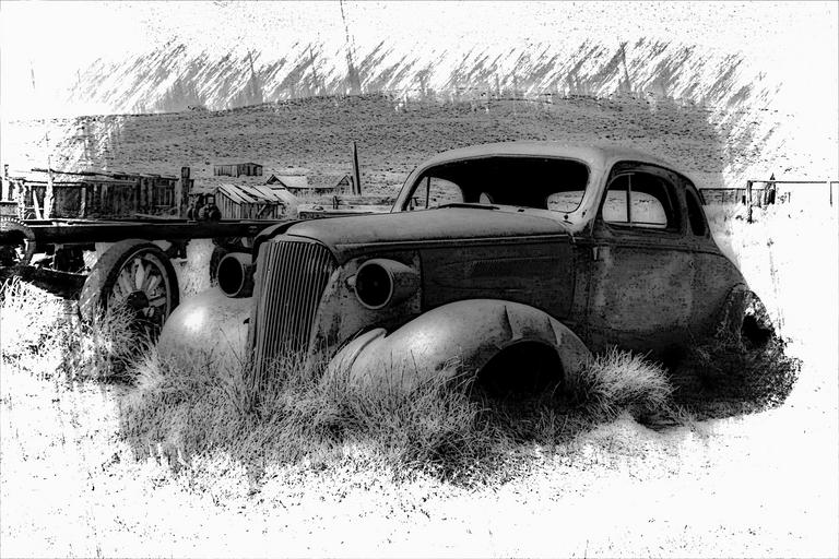 Keywords: bodie ghost town california usa legacy old car rusty old timer wild west called orton effect automobile tourist attraction gold mine metal mine commodities antique ancient deserted wild west romantic heritage black and white computer graphic artwork digital art desert scenery landscape |