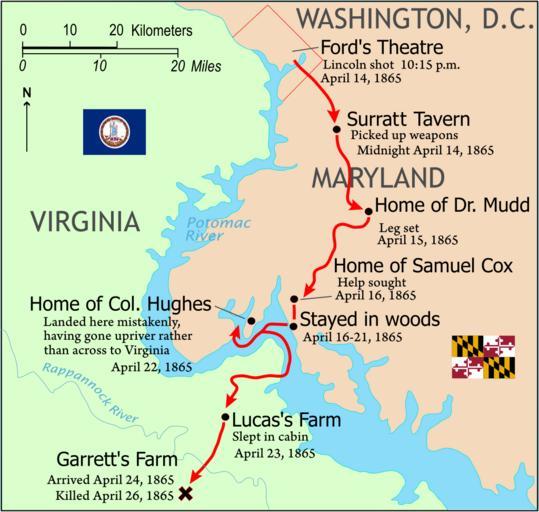Keywords: Booth escape route.svg en John Wilkes Booth's escape route tr John Wilkes Booth'un kaçış rotası Image Booth escape route png Image Flag of Virginia svg Image Flag of Maryland svg Derivative work for Wikipedia by en User JGHowes author of SVG Kuara 2007-10-14 first version ; 2008-12-11 very last version Image Booth escape route png PD-USGov-Interior-NPS Maps of the history of the United States Assassination of Abraham Lincoln John Wilkes Booth User JGHowes |