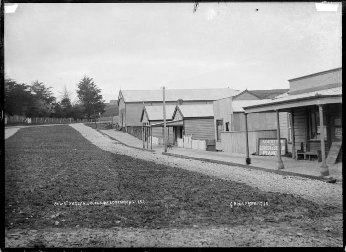 Keywords: blackandwhite monochrome outdoor building architecture black and white View along Bow Street, Raglan, from the south side looking east, photographed in 1910, probably by Gilmour Brothers Store, Raglan (Robert Gilmour, proprietor). A board advertising "Agent for London & Berlin Piano Co." is visible centre right. Inscriptions: Inscribed - Photographer's title on negative -bottom left: Bow St. Raglan. Southside looking east. 152bottom right: G Bros Protd 1.7.10. Quantity: 1 b&w original negative(s). Physical Description: Dry plate glass negative 4.5 x 6.5 inches Gilmour Brothers (Firm). Bow Street, Raglan, southside looking east, 1910 - Photograph taken by Gilmour Brothers. Price, William Archer, 1866-1948 :Collection of post card negatives. Ref: 1/2-000318-G. Alexander Turnbull Library, Wellington, New Zealand. natlib.govt.nz/records/23040670 View along Bow Street, Raglan, from the south side looking east, photographed in 1910, probably by Gilmour Brothers Store, Raglan (Robert Gilmour, proprietor). A board advertising "Agent for London & Berlin Piano Co." is visible centre right. Inscriptions: Inscribed - Photographer's title on negative -bottom left: Bow St. Raglan. Southside looking east. 152bottom right: G Bros Protd 1.7.10. Quantity: 1 b&w original negative(s). Physical Description: Dry plate glass negative 4.5 x 6.5 inches Gilmour Brothers (Firm). Bow Street, Raglan, southside looking east, 1910 - Photograph taken by Gilmour Brothers. Price, William Archer, 1866-1948 :Collection of post card negatives. Ref: 1/2-000318-G. Alexander Turnbull Library, Wellington, New Zealand. natlib.govt.nz/records/23040670 |