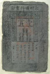Keywords: British Museum Ming banknote.jpg en Chinese Ming banknote for 1 guan 1 string of 1000 cash China AD 1375 Seal script inscription two vertical lines reading right-to-left on either side of 1 Guan 大明寶鈔 / å¤©ä¸‹é šè¡Œ Great Ming precious money for circulation throughout the empire zh å¤§æ˜Žå® é’ž BabelStone own Museum British Museum credit line 2010-08-21 Details Chinese Ming banknote for 1 guan 1 string of 1000 cash China AD 1375 Height 341 mm<br/>Width 222 mm Room 68 cc-zero Banknotes of the Ming Empire A History of The World in 100 Objects 72 Room 68 British Museum |