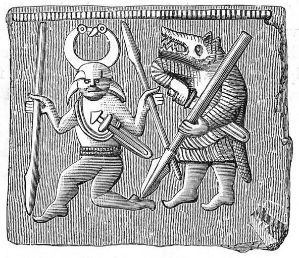 Keywords: Bronsplåt pressbleck öland vendeltid.jpg Vendel era bronze plate Place of discovery Öland Sweden Depicted are a berserker on the right and Oden on the left also noted looks like a berserk hunter about to decapitate his enemy Oden's famous characters markers are non-existent in that carving Bronsplåt med upphöjda bilder för pressning av tunt bronsbleck vendeltid Fyndplats Öland Eventuellt föreställer figuren till höger en bärsärk eller ulvhedin figuren till vänster Oden Umzeichnung eines Bronze-Pressbleches der Vendelzeit Fundplatz Öland Schweden Oscar Montelius Om lifvet i Sverige under hednatiden Stockholm 1905 s 98 before 1905 author PD 150px Woodcut in higher resolution 6 9 Mpx 150px Old photo of the original helmet plate patrix 0 4 Mpx 150px Photo of replika 1 1 Mpx PD-old-70-1923 Bird-horned helmets Om lifvet i Sverige under hednatiden 1905 Torslunda helmet plate patrices Woodcuts of Sweden Horned masks Humans with fictional creatures 20th-century woodcuts |