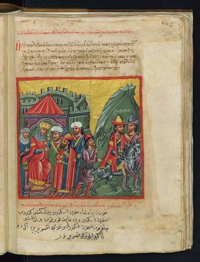 Keywords: Byzantine Greeks Alexander Manuscript.JPG en A fourteenth-century miniature Greek manuscript depicting scenes from the life of Alexander the Great depicted entirely in Byzantine fashion of the period Late Byzantine period 1204-1453 Alexander Romance in S Giorgio dei Greci in Venice When Candake heard how Alexander had subjugated those great kings she sent a painter to draw the picture of Alexander secretly In this miniature the queen is depicted to the left when she expresses her wish to the painter the gesture with her left hand is particularly expressive as well as the almost conspiratorial stares of the figures The painter wears a conical hat with a pointed top which is characteristic of his profession in this case It is noteworthy that this hat which occurs in the Byzantine painting since the 14th century became particularly popular during the 15th century from the representations of Ioannis Palaeologos In Italy this hat capelletto alla greca is depicted in the 15th century in the works of Piero della Francesca and it always indicates the origin of the person portrayed from the Byzantium In the miniature the painter with a companion who wears a hat of the same type depart on horseback to the right and another assistant follows them on foot with his bag hung on his shoulder el Η Κανδάκη στέλνει κρυφά στον Αλέξανδρο ένα ζωγράφο για να του κάνει κρυφά το ορτραίτο Rubric top + η δε κανδάκη ακούσασα ερί αλεξάνδρου ό ως χειρούται τους τηλικούτους βασιλείς Rubric bottom έ εμψε ζωγράφον α ελθείν κρυφίως και το ομοίωμα λαβείν αλεξάνδρου image http //194 177 217 107/gr/showpic asp picpath 9999_min_01_143r curtable miniatures currecord 170 vorder 1 vmode miniat Miniature of the Alexander Romance a fourteenth-century book<br/> Website http //www istitutoellenico org/english/pubblicazioni/index5 html Hellenic Institute of Byzantine and Post-Byzantine Studies in Venice<br/> Creator Unknown 1204-1453 PD-old-100 Byzantine Alexander Romance Venice |