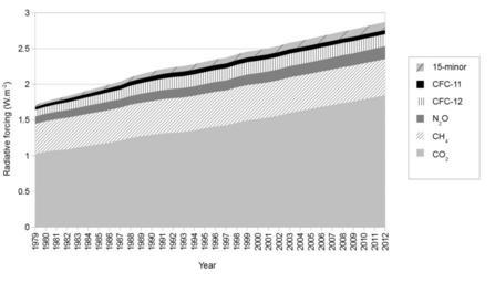 Keywords: Changes in radiative forcing of long-lived greenhouse gases between 1979-2012.png radiative forcing of long-lived greenhouse gases between 1979-2012 These gases are carbon dioxide CO<sub>2</sub> methane CH<sub>4</sub> nitrous oxide N<sub>2</sub>O chlorofluorocarbon-12 CFC-12 CFC-11 and fifteen other minor long-lived halogenated gases The 15 other halogenated gases are CFC-113 tetrachloromethane CCl<sub>4</sub> trichloromethane CH<sub>3</sub>CCl<sub>3</sub> ; hydrochlorofluorocarbons HCFCs 22 141b and 142b; hydrofluorocarbons HFCs 134a 152a 23 143a and 125; sulfur hexafluoride SF<sub>6</sub> and halons 1211 1301 and 2402 The graph does not include other forcings such as aerosols and changes in solar activity Summary Total forcing in 1979 was 1 712 watts per square metre W m<sup>-2</sup> and has steadily increased over time to 2 873 W m<sup>-2</sup> in 2012 Between 1979-2012 the largest contributors to radiative forcing have been CO<sub>2</sub> and CH<sub>4</sub> In 2012 the percentage contributions of each gas to total forcing was approximately CO<sub>2</sub> 64 CH<sub>4</sub> 18 N<sub>2</sub>O 6 CFC-12 6 CFC-11 2 15 minor gases 4 Forcing data are briefly summarized below All the data are available in a later section as comma-separated values The first value is the year followed by forcing values in W m<sup>-2</sup> for CO<sub>2</sub> CH<sub>4</sub> N<sub>2</sub>O CFC-12 CFC-11 the 15-minor halogenated gases and total forcing respectively 1979 1 027 0 419 0 104 0 092 0 039 0 031 1 712 1980 1 058 0 426 0 104 0 097 0 042 0 034 1 761 1990 1 293 0 472 0 129 0 154 0 065 0 065 2 178 2000 1 513 0 494 0 151 0 173 0 066 0 083 2 481 2010 1 791 0 504 0 174 0 170 0 060 0 106 2 805 2012 1 846 0 507 0 181 0 168 0 059 0 111 2 873 References citation THE NOAA ANNUAL GREENHOUSE GAS INDEX AGGI NOAA/ESRL Global Monitoring Division http //www esrl noaa gov/gmd/aggi/aggi html Butler J H and S A Montzka 1 August 2013 own Enescot 2013-08-04 Data Data are in the public-domain and are taken from the cited source Butler and Montzka 2013 These data were exported from OpenOffice org 3 4 1 Calc as comma separated values csv The following options were used Character set Western Europe 1252 Field delimiter Text delimiter Quote all text cells no Save cell content as shown yes Fixed column width no <pre> Year CO2 CH4 N2O CFC12 CFC11 15-minor Total CO2-eq ppm AGGI 1990 1 AGGI change 1979 1 027 0 419 0 104 0 092 0 039 0 031 1 712 383 0 786 1980 1 058 0 426 0 104 0 097 0 042 0 034 1 761 386 0 808 2 8 1981 1 077 0 433 0 107 0 102 0 044 0 036 1 799 389 0 826 2 2 1982 1 089 0 440 0 111 0 108 0 046 0 038 1 831 391 0 841 1 8 1983 1 115 0 443 0 113 0 113 0 048 0 041 1 873 395 0 860 2 2 1984 1 140 0 446 0 116 0 118 0 050 0 044 1 913 397 0 878 2 2 1985 1 162 0 451 0 118 0 123 0 053 0 047 1 953 401 0 897 2 1 1986 1 184 0 456 0 122 0 129 0 056 0 049 1 996 404 0 916 2 2 1987 1 211 0 460 0 120 0 135 0 059 0 053 2 039 407 0 936 2 2 1988 1 250 0 464 0 123 0 143 0 062 0 057 2 099 412 0 964 3 0 1989 1 274 0 468 0 126 0 149 0 064 0 061 2 144 415 0 984 2 1 1990 1 293 0 472 0 129 0 154 0 065 0 065 2 178 418 1 000 1 6 1991 1 313 0 476 0 131 0 158 0 067 0 069 2 213 420 1 016 1 6 1992 1 324 0 480 0 133 0 162 0 067 0 072 2 238 422 1 027 1 1 1993 1 334 0 481 0 134 0 164 0 068 0 074 2 254 424 1 035 0 7 1994 1 356 0 483 0 134 0 166 0 068 0 075 2 282 426 1 048 1 3 1995 1 383 0 485 0 136 0 168 0 067 0 077 2 317 429 1 064 1 5 1996 1 410 0 486 0 139 0 169 0 067 0 078 2 350 431 1 079 1 4 1997 1 426 0 487 0 142 0 171 0 067 0 079 2 372 433 1 089 0 9 1998 1 465 0 491 0 145 0 172 0 067 0 080 2 419 437 1 111 2 0 1999 1 495 0 494 0 148 0 173 0 066 0 082 2 458 440 1 128 1 6 2000 1 513 0 494 0 151 0 173 0 066 0 083 2 481 442 1 139 0 9 2001 1 535 0 494 0 153 0 174 0 065 0 085 2 506 444 1 150 1 0 2002 1 564 0 494 0 156 0 174 0 065 0 087 2 539 447 1 166 1 3 2003 1 601 0 496 0 158 0 174 0 064 0 088 2 580 450 1 185 1 6 2004 1 627 0 496 0 160 0 174 0 063 0 090 2 610 453 1 198 1 1 2005 1 655 0 495 0 162 0 173 0 063 0 092 2 640 455 1 212 1 2 2006 1 685 0 495 0 165 0 173 0 062 0 095 2 675 458 1 228 1 3 2007 1 710 0 498 0 167 0 172 0 062 0 097 2 706 461 1 242 1 1 2008 1 739 0 500 0 170 0 171 0 061 0 100 2 742 464 1 259 1 3 2009 1 760 0 502 0 172 0 171 0 061 0 103 2 768 466 1 271 1 0 2010 1 791 0 504 0 174 0 170 0 060 0 106 2 805 470 1 288 1 3 2011 1 818 0 505 0 178 0 169 0 060 0 109 2 838 473 1 303 1 2 2012 1 846 0 507 0 181 0 168 0 059 0 111 2 873 476 1 319 1 2 </pre> Global warming graphs Greenhouse gases Cc-zero |