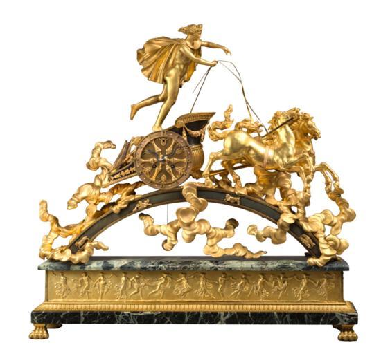 Keywords: Chariot clock Phaeton.png en Also known as the chariot of Apollo the biga is driven by the god with his cloak floating in the breeze representing Phaeton ™s flight driving the sun chariot across the heavens Thomire ™s clock portrayed the moment when Phaeton was still revelling in his ecstatic journey unaware that soon his horses would bolt and he would be plunged to his death The dial with a chapter ring decorated with Arabic numerals and six inner gilded spokes in the shape of torchères interspersed with palmettes and a pair of serpentine-shaped hands The car is decorated with ribbon-tied swags on the front palmettes leafy scrolls a pair of griffin heads at each side an archer ™s bow and a lyre at the rear The arch is adorned with floating ormolu bronze clouds and mounted with four signs of the Zodiac from left to right Aries Aquarius Taurus and Piscis against a patinated background The green marble rectangular base is highlighted by a frieze of dancing classical figures in low relief holding their hands The base rests on four bronze lion paw feet France First Empire period Own archive Pierre-Philippe Thomire 1751-1843 Bronzier 1805 Chariot clock PD-old-100 |