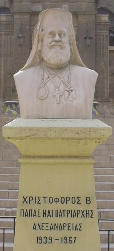 Keywords: Christoforos2.jpg Bust of Christopher II Χριστόφορος ο Β΄ Πατριάρχης και Πά ας Αλεξανδρείας και άσης Αφρικής Greek Orthodox patriarch of Alexandria from 1939 to 1966 It's located between the St George's Convent and the St George's Church in Cairo Egypt own 2006-01-16 User Dantadd Photographs taken by User Dantadd Statues in Cairo Busts in Egypt Sculptures of bishops Greek Orthodox Patriarchs of Alexandria |