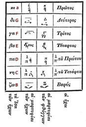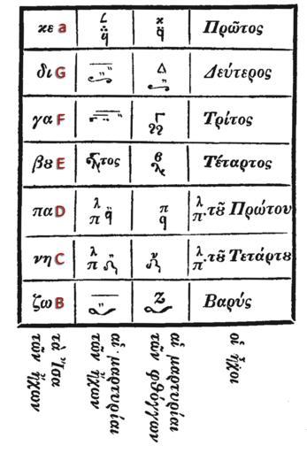 Keywords: ChrysanthosOktoechosBaseis.png en The disposition of the eight modes main and medial signatures of the Byzantine Octoechos and their basis tones in the diapason system according to Chrysanthos of Madytos and the New Method Neume Notation since 1814 el Τῶν εἰρημένων κτὼ ἤχων αἱ βάσεις ἤγουν τὰ Ἴσα ἑκάστου αὐτῶν ὅταν ζητῆται νὰ φανερωθῶσι καὶ ἡ σῳζομένη ἐν αὐτοῖς τάξις ὸ τοῦ ξέος ἐ ὶ τὸ βαρὺ καὶ αἱ μαρτυρίαι αἵ τινες φανερόνουσι τοὺς ἤχους καὶ γράφονται ρὸ τῶν μελῶν καὶ αἱ μαρτυρίαι τῶν φθόγγων τῆς μελῳδίας αἱ τινες γράφονται ερὶ τὰ μέσα αὐτῆς εἶναι δυνατὸν νὰ ἐκφρασθῶσι μὲ τὸν τρό ον τὸν ὁ οῖον αριστᾷ ὁ ἑξῆς ίναξ Chrysanthos 1832 Θεωρητικὸν μεγὰ τῆς ουσικῆς Triest Michele Weis 168 Platonykiss annotation 2012-09-06 PD-Old PD-US-unpublished Chrysanthos of Madytos |