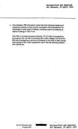 Keywords: CIA Memo2.jpg Page 2 of 2 from a CIA memo dated August 2001 concerning a possible attack by Bin Laden on the United States of America Original text en wikipedia by en User Andrei Stroe using http //tools wikimedia de/~magnus/commonshelper php CommonsHelper <br/> original text 1 National Security Archives 6 August 2001<br/> first version ; last version Unknown CIA Wiki1609 wikipedia en Later version s were uploaded by Noahcs at http //en wikipedia org en wikipedia Wiki1609 wikipedia en Original text PD-USGOV-CIA <br/> original text 1 Declassified by the US Government on 10 April 2004 60px page 1 of 2 Original upload log en wikisource Billinghurst CommonsHelper en wikisource Memo2 jpg 2006-07-10 01 21 Sherurcij 1120×1859× 161485 bytes <nowiki></nowiki> CIA documents Secrecy Documents of the government of the United States Osama bin Laden PD-USGov |