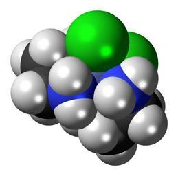 Keywords: Cis-Dichlorobis(ethylenediamine)cobalt(III) cation 3D spacefill.png Space-filling model of the cis-dichlorobis ethylenediamine cobalt III complex This image shows the Λ lambda isomer as a cation positive charge Colour code 505050 Carbon C black<br> F0F0F0 Hydrogen H white<br> 3C50FA Nitrogen N blue<br> 14F014 Chlorine Cl green<br> 7078C0 Cobalt Co grey-blue<br> 2011-06-15 own DS Visualizer Jynto talk Cationic form ball-and-stick version Chloride salt ball-and-stick version Chloride salt space-filling version cc-zero cobalt complexes ethylenediamino complexes chloro complexes Complex cations Images by Jynto Space-filling models |