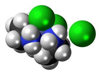 Keywords: Cis-Dichlorobis(ethylenediamine)cobalt(III) chloride 3D spacefill.png Space-filling model of the cis-dichlorobis ethylenediamine cobalt III complex This image shows the Λ lambda isomer as a chloride salt Colour code 505050 Carbon C black<br> F0F0F0 Hydrogen H white<br> 3C50FA Nitrogen N blue<br> 14F014 Chlorine Cl green<br> 7078C0 Cobalt Co grey-blue<br> 2011-06-15 own DS Visualizer Jynto talk Cationic form ball-and-stick version Cationic form space-filling version Chloride salt ball-and-stick version cc-zero cobalt complexes ethylenediamino complexes chloro complexes Images by Jynto Space-filling models |