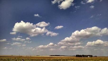 Keywords: Over a pumpkin patch (notice the people's heads along the bottom) on a nice fall day. Too bad the human marks (house, powerlines, etc) aren't there or aren't more pronounced. Instead they're just kind of there, neither the focal point, nor faded away.