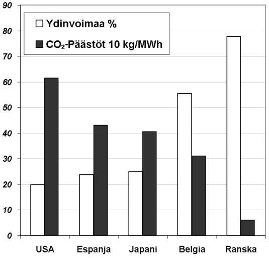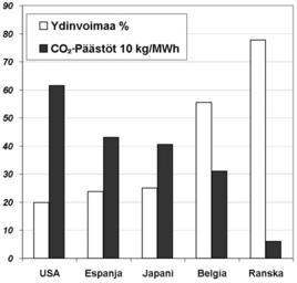 Keywords: Co2 ja ydinvoima.png fi Finnish Wikipedia Tungsten Ydinvoiman osuus sähköntuotannosta ja sähköntuotannon hiilidioksidipäästöt suhteessa tuotettuun energiaan eräissä maissa Proportion of nuclear power of electricity generation white bars and emissions of carbon dioxide by electricity generation in proportion to produced energy black bars in certain countries United States Spain Japan Belgium and France Finnish titles Sources IAEA http //www iaea org/cgi-bin/db page pl/pris charts htm Nuclear Power Plant Information VTT Energia Suomessa Helsinki 1999 Political bar charts Energy schemas and diagrams Carbon dioxide IAEA |