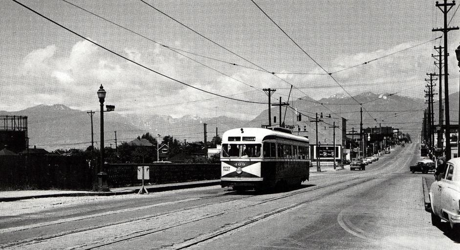 Keywords: road outdoor blackandwhite train vehicle monochrome cable locomotive black and white BC Electric Railway Co. PCC streetcar No. 409 bound for Cedar Cottage crosses over the Great Northern cut on Commercial Drive at East 8th Avenue in Vancouver, BC. View looking north up Commercial Drive. 1952 photograph. [BC Hydro photo] BC Electric Railway Co. PCC streetcar No. 409 bound for Cedar Cottage crosses over the Great Northern cut on Commercial Drive at East 8th Avenue in Vancouver, BC. View looking north up Commercial Drive. 1952 photograph. [BC Hydro photo] |