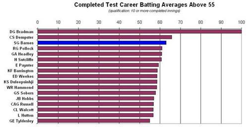 Keywords: Completed Test batting averages 10 or more innings, Barnes.jpg Completed cricket batting averages above 55 Qualification 10 or more completed innings self-made Data from http //www cricketarchive com/Archive/Records/Tests/Overall/Highest_Batting_Average html Cricketarchive 2007-11-29 Moondyne Public domain Data source Graph derived from data at http //www cricketarchive com/Archive/Records/Tests/Overall/Highest_Batting_Average html Cricketarchive wikitable - Player Innings Average - DG Bradman 80 99 94 - MEK Hussey 29 86 18 - CS Dempster 15 65 72 - SG Barnes 19 63 05 - RG Pollock 41 60 97 - GA Headley 40 60 83 - H Sutcliffe 84 60 73 - RT Ponting 186 59 42 - E Paynter 31 59 23 - KF Barrington 131 58 67 - ED Weekes 81 58 61 - KS Duleepsinhji 19 58 52 - WR Hammond 140 58 45 - JH Kallis 189 58 2 - GS Sobers 160 57 78 - JB Hobbs 102 56 94 - CAG Russell 18 56 87 - CL Walcott 74 56 68 - L Hutton 138 56 67 - RS Dravid 193 56 25 - KC Sangakkara 112 55 73 - Mohammad Yousuf 130 55 71 - GE Tyldesley 20 55 - SR Tendulkar 228 54 93 - CA Davis 29 54 2 - VG Kambli 21 54 2 - GS Chappell 151 53 86 - AD Nourse 62 53 81 - MP Donnelly 12 52 9 - BC Lara 232 52 88 - KP Pietersen 57 52 69 - A Melville 19 52 58 - Javed Miandad 189 52 57 - ML Hayden 162 52 56 - CF Walters 18 52 26 - J Ryder 32 51 62 - A Flower 112 51 54 - SM Gavaskar 214 51 12 - SR Waugh 260 51 06 - AR Border 265 50 56 - IVA Richards 182 50 23 - DCS Compton 131 50 06 - Cricket graphs Sid Barnes |