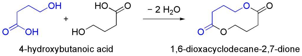 Keywords: Condensation of 2x 4-hydroxybutanoic acid to form the lactide.png Reaction scheme of a condensation of 2 molecules of 4-hydroxybutanoic acid to form the lactide 1 6-dioxacyclodecane-2 7-dione Selfmade with ChmDraw 2006-07-16 Calvero PD GHB Substitution reactions |