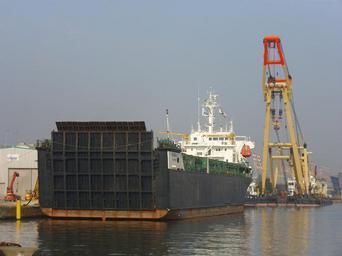 Keywords: Condock V and Enak.jpg en The heavy lift vessel Condock V in the port of Bremerhaven Behind Condock V is the floating crane Enak de Das Dockschiff Condock V und dahinter der Schwimmkran Enak im Kaiserhafen I von Bremerhaven own Tvabutzku1234 2011-10-02 53 33 3 48 N 8 34 2 12 E region DE_heading NW Cc-zero Condock V ship 1984 Floating cranes |