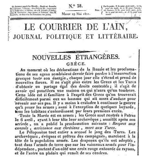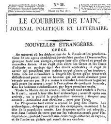 Keywords: Courier Ain 1821 Patra+title.JPG en News about the outbreak of the Greek Revolution in Patras 25 March/6 April 1821 el Η είδηση για την έκρηξη της Ε ανάστασης στην Πάτρα 25 αρτίου/6 Α ριλίου 1821 1821-05-29 Courrier de l' Ain newspaper 29 May 1821 p 4 http //www archives-numerisees ain fr/archives/resultats/journauxnumerises/n 100 RECH_nom 5B0 5D Courrier+de+l 27Ain type journauxnumerises anonymous other versions PD-old-70-1923 Uploaded with UploadWizard Greek Revolution 1821 Palaion Patron Germanos |